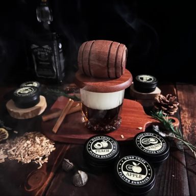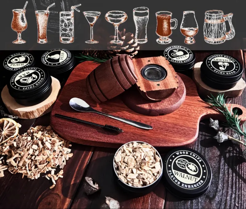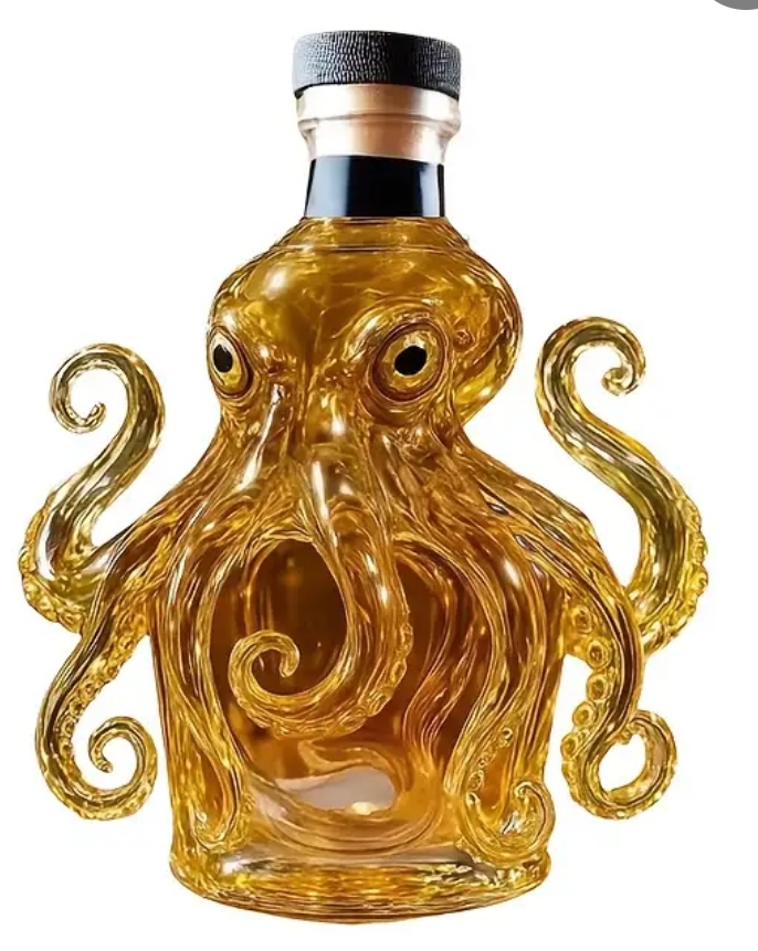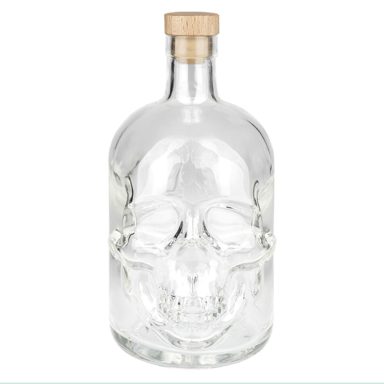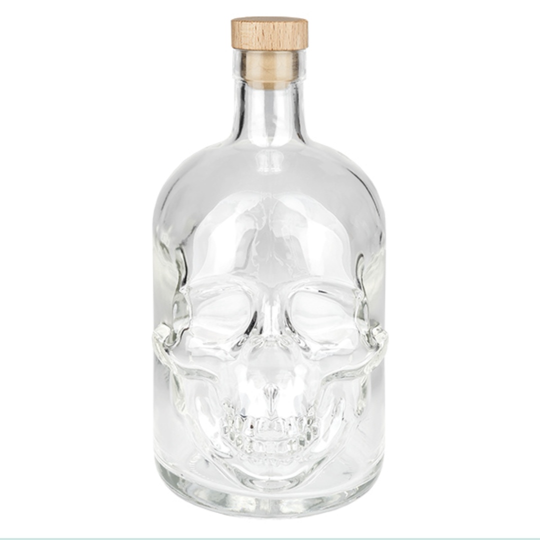 Composé d'une bouteille tête de mort de 700ml, d'une petite bouteille poulpe, d'un verre et son socle, d'un fumoir avec plusieurs boites de copeaux de bois parfumés pour aromatiser vos alcools et d'un petit coffre en décoration.
