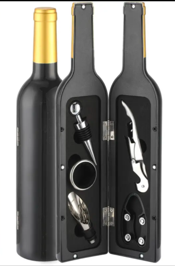 Box composée d'un ensemble pour bouteille de vin ( tire bouchon, bouchon ...), d 'un bouchon aerateur, d'un thermometre et d'un porte bouteille .